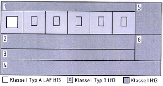 Die Zuluft muss mit Filtern der Klassen F8 oder F9 filtriert werden (EN779). Als Vorfilter können die Klassen F5 bis F7 empfohlen werden [4]. Der Dichtsitz aller F-Filter muss - i.Ggs.z. den Empfehlungen der EN779 - die Anforderungen für Filter der Klasse F9 erfüllen (mit der Möglichkeit, Filterkombinationen den Standzeiterfahrungen entsprechend zu ändern).
