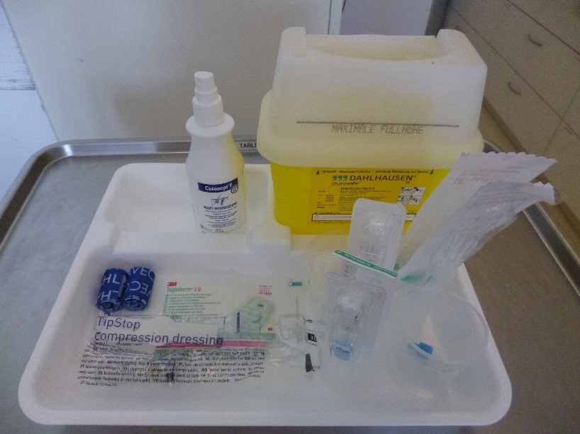 Bei Begehungen auf Station sieht man nicht selten schmutzige, Blut-verschmierte oder inkorrekt zusammengestellte Tabletts, die zur Blutabnahme eingesetzt werden. Auf Foto 1 fehlt beispielsweise ein adäquater Abwurfbehälter für Spitzabfälle; stattdessen werden die Nadeln und Butterflies in einen offenen Becher abgeworfen. Ursache derartiger Situationen ist, dass sich weder die Blut abnehmenden Ärzte und PJ-Studenten noch die Pflegekräfte für die Reinigung und Ordnung zuständig fühlen. Die Einhaltung der Ordnung und Sauberkeit der Tabletts muss auf Station zwischen Ärzten/PJ-Studenten und Pflegekräften geregelt werden, im Streitfall ist es primär Aufgabe derjenigen, die Blut abnehmen. Foto 2 zeigt beispielhaft ein gut strukturiertes, zuvor wischdesinfiziertes Tablett (mit Abwurfbehälter für Spitzabfälle).